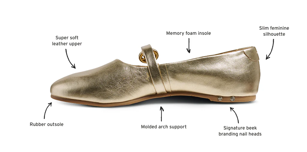 - Signature two metal studs at inside of sole - our classic beek branding.