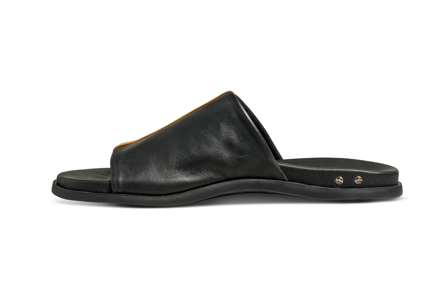 The CREST slide sandal is available in our black leather and caramel suede colors.